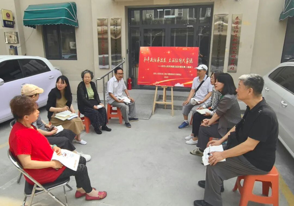 “和平夜话再出发,立法征询大家说”,天津小白楼街道基层立法联系点到社区征集对生态环境法典(草案)的意见。(全国人大常委会法工委供图)