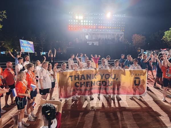 8月17日晚,第十二届世界运动会闭幕式在四川成都世界园艺博览园国际友谊馆举行。图为运动员手举“Thank you Chengdu”的横幅。视觉中国供图