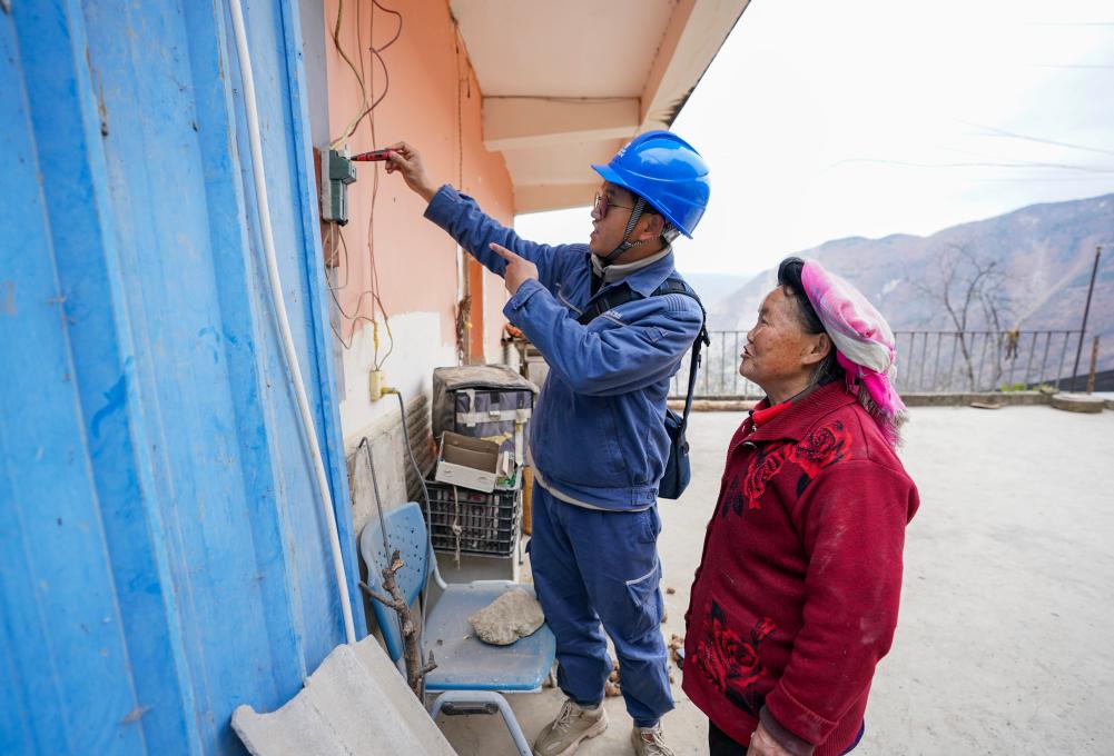 南方电网的工作人员正给黄关芬家检查电表。新华社记者陈欣波摄
