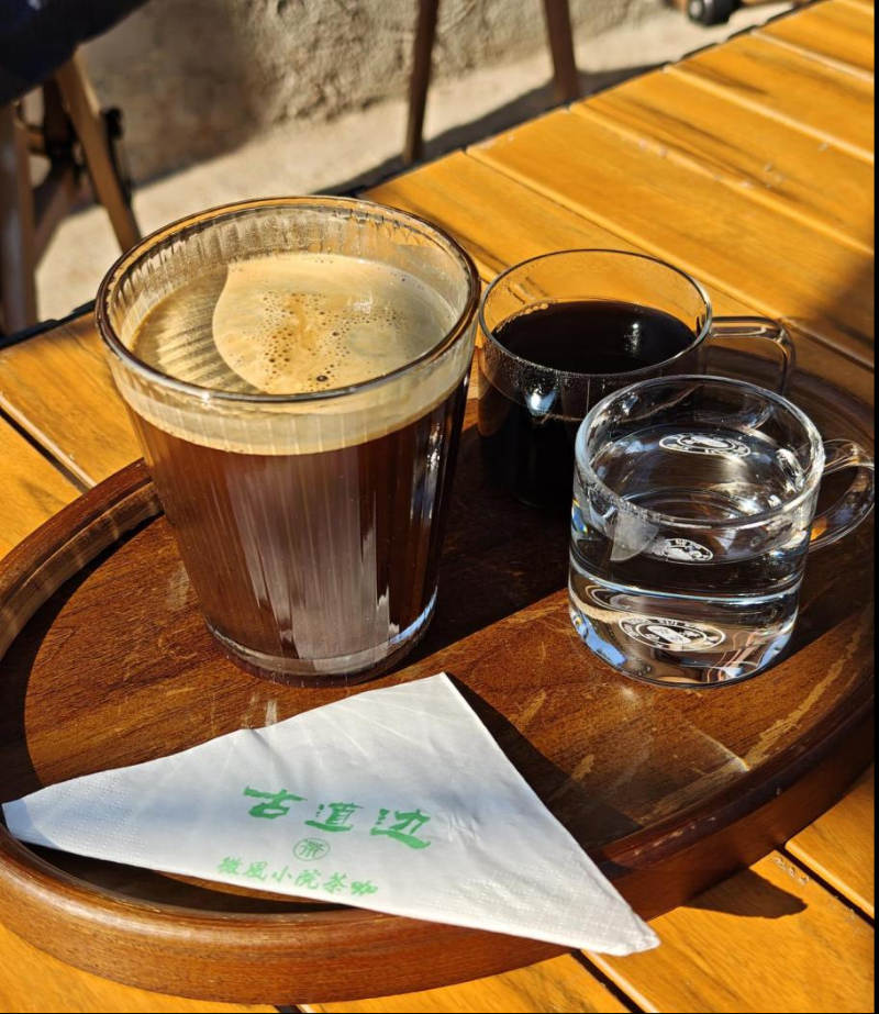 距离市区一小时车程的那柯里,这座昔日茶商歇脚、马帮驻足的古老驿站,如今焕发出新生机:老院落里,一层是普洱茶饼非遗制作体验场,二层是飘着咖香的咖啡馆,三层保留着晒茶晾茶的老场地,青石板路上的马蹄印犹在,茶香与咖香在此自然相遇、相融。我们点了一杯酸角美式咖啡,店家还赠送了普洱茶与清口温水,一句“有咖必有茶”,藏着普洱人不抛弃传统、不抗拒新潮的生活智慧。