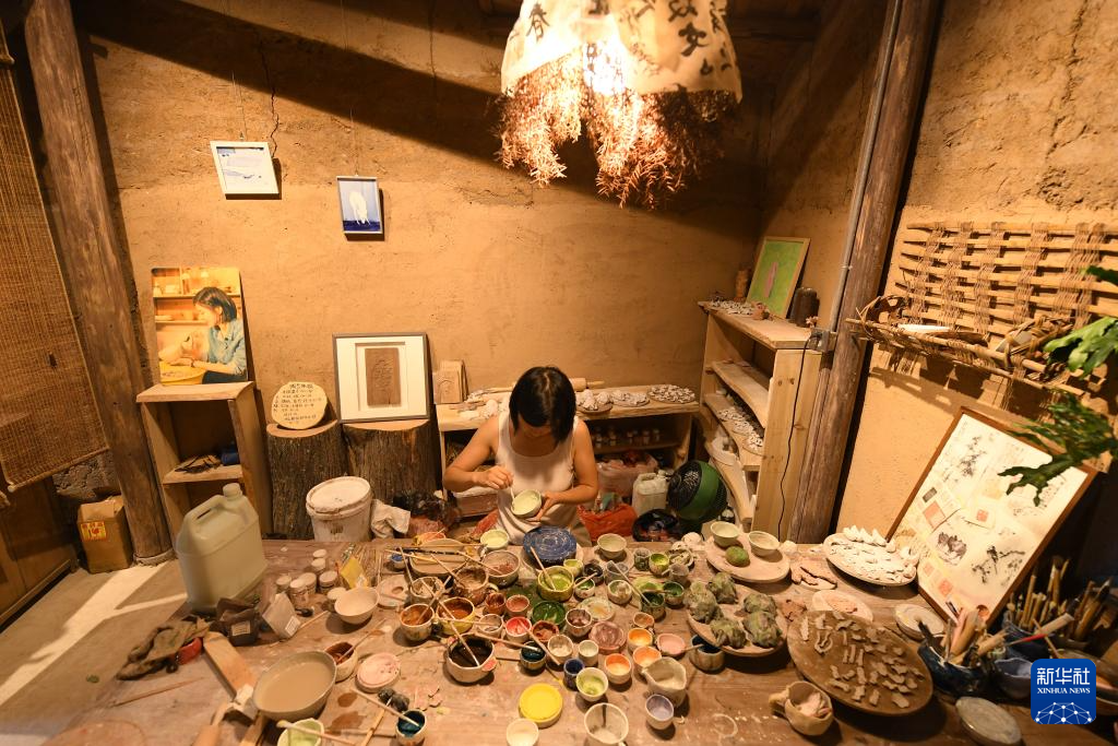在浙江省丽水市松阳县松庄村,来自河南的陶艺家何素素在自己的“诉土”陶艺工作室制作陶器(2024年7月17日摄)。新华社记者 翁忻旸 摄