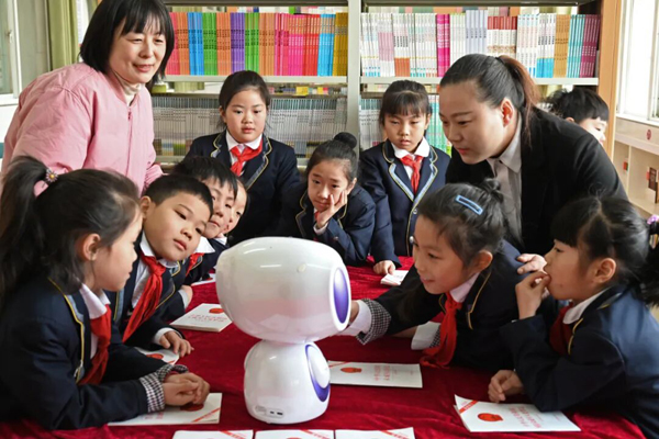 河南漯河源汇区司法局工作人员在课堂上操作普法机器人和孩子们互动学法。来源:视觉中国