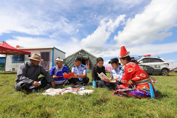 2025年8月13日,甘肃张掖肃南裕固族自治县皇城镇司法所工作人员深入夏日塔拉草原,为牧民群众开展普法宣讲活动。来源:视觉中国