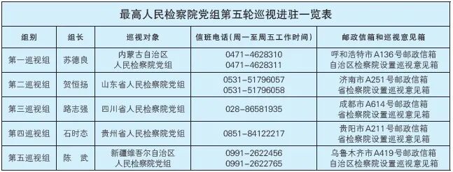正义网北京10月22日电(记者刘亭亭)根据最高人民检察院党组统一部署,最高检党组第五轮巡视分别对内蒙古、山东、四川、贵州、新疆5个省级检察院党组开展为期两个月的常规巡视。10月14日,最高检党组召开第五轮巡视动员部署会,其后开展了为期两天半的巡前培训。近日,各巡视组完成巡视进驻。