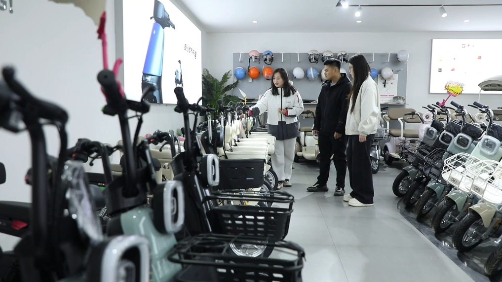 12月1日,河北省馆陶县某电动自行车零售店内,商家在给顾客介绍产品。新华社记者 张玮华 摄